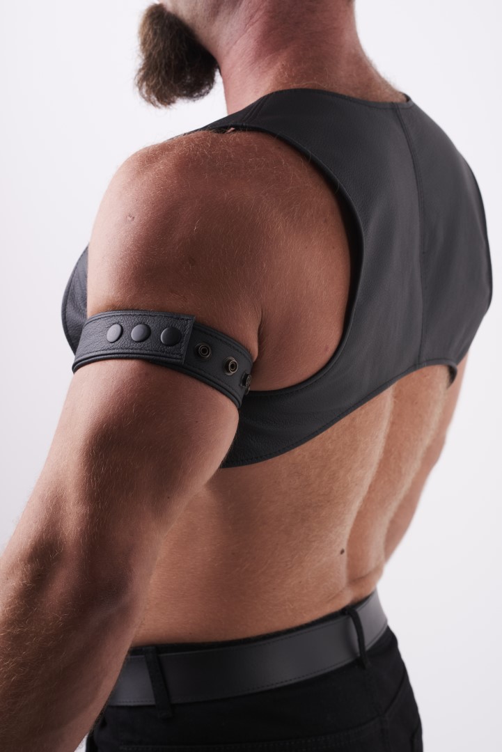 Das feine Leder schmiegt sich perfekt an Deinen heißen Oberkörper und bedeckt Deine Schulterblätter.