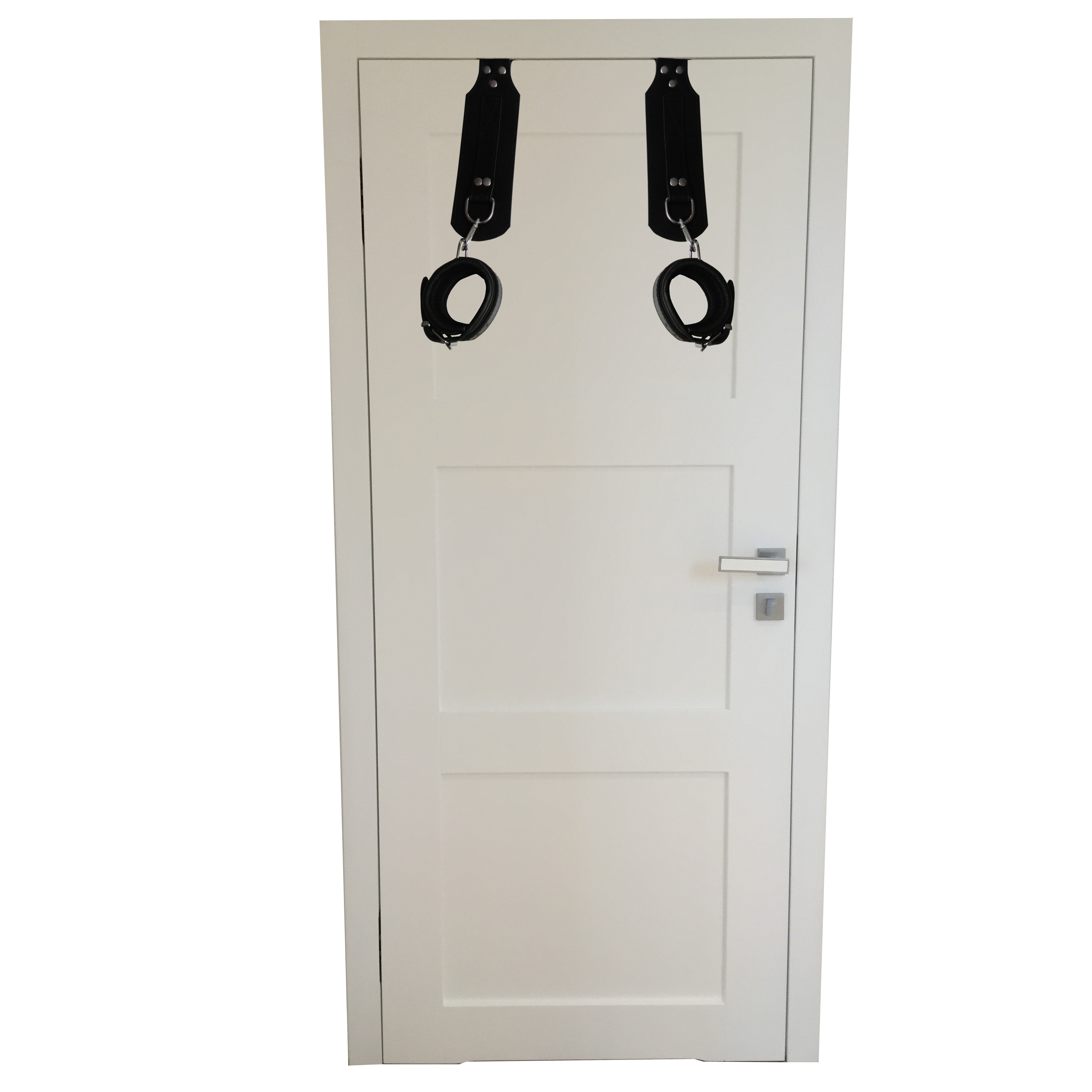 Produktinformationen "Leder Türaufhängesystem im Türrahmen mit Handfessel Schwarz und Karabiner - Türfessel"
