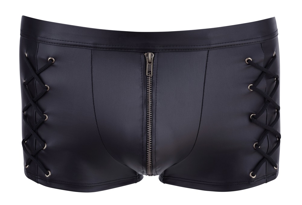 Schwarze Pants mit unterlegtem Messing-Reißverschluss in der Front. An den Seiten mit markanten Schnürungen. Bundgummi bezogen. Elastische, anschmiegsame Top-Qualität mit hohem Tragekomfort. 90% Polyester, 10% Elasthan, Beschichtung Polyurethan.